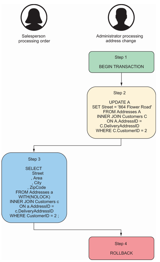 SQL Server 使用锁定来确保一个事务无法读取当前被其他事务修改的数据。通过使用 NOLOCK 查询提示,我们防止了 SELECT 语句获取任何锁。因此,销售人员在事务执行更新时可以从表中读取地址。执行更新的事务随后被回滚。这导致销售人员读取到一个从未真正提交过的送货地址,因此在数据库中根本不存在。
