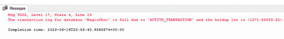 该语句将导致一个非常大的事务。在事务打开期间,事务日志无法截断自身以释放空间。即使在简单恢复模型中也是如此(我们将在第12章讨论恢复模型)。事实上,事务将变得如此之大,以至于事务日志空间耗尽,查询将回滚,从而导致抛出9002错误,如图5.7所示。