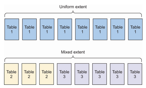 T1118用于强制统一区。 这意味着多个对象不能将页分配到同一区。默认情况下,小对象(小于64 KB)可以使用混合区。强制使用统一区有助于防止系统页(例如全局分配映射(GAM)、共享全局分配映射以及每个数据文件中存在的页空闲空间系统页)出现争用。统一区与混合区如图10.1所示。