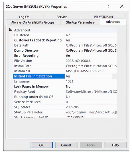 当 SQL Server 创建文件或扩展文件时,它必须将文件清零,这字面意思是用 0 填充任何空白空间。作为性能优化,可以通过使用瞬时文件初始化来跳过数据文件,有时也可以跳过事务日志文件的这一过程。为此,我们只需将运行数据库引擎服务的服务帐户赋予“执行卷维护任务”用户权限(SeManageVolumePrivilege)。SQL Server 就会在文件创建或扩展时自动跳过清零过程。微软在最近版本的 SQL Server 中更是简化了这一操作,在安装过程中将其作为一个选项提供。同时,它也将其作为一个选项添加到 SQL Server 配置管理器中数据库引擎服务的高级选项卡中,如图 10.2 所示。